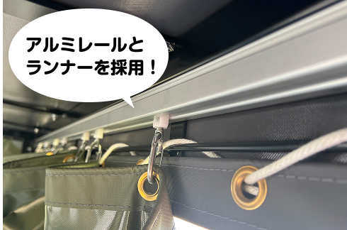 軽トラックではそれで十分とされてきましたが、ラクホロカーテンはスムーズな開閉を実現するためにアルミのレールにランナーを通す構造を採用しました。中型車などではこのようなレールが使われるのが一般的ですが、それは全長が長いと丸棒がカーテンの重さで垂れてしまうから。