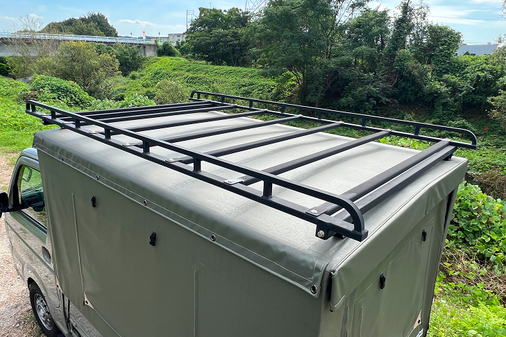 ルーフパイプ上に縦横にラックを組み上げる事でルーフキャリアとして長尺物以外の荷物を屋根上に積むことが出来ます。迫力ある見た目もGOOD!