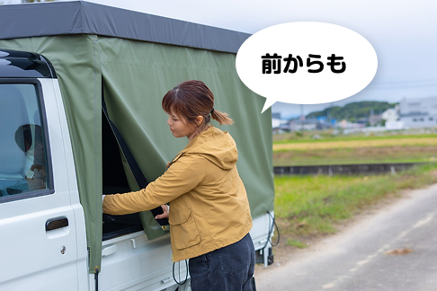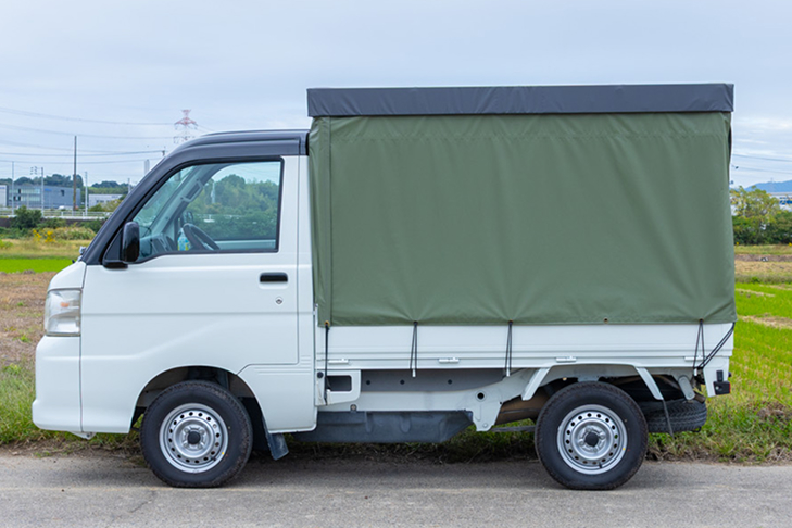 カーテン式の幌は軽トラックではあまり馴染みが無い方もいるかもしれませんが、リアシートが横開きのカーテンになっている幌は昔から多く作られています。