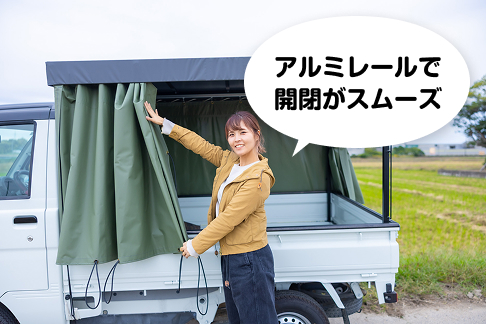 ラクホロカーテンなら一般的な巻き上げタイプの幌に比べて開閉がとっても簡単、とってもスマート♪