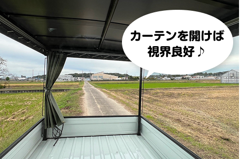 こちらのカーテン無し仕様は天井部分のシートに加えてフロントシートも付属しておりますので前方からの雨については軽減してくれますよ。